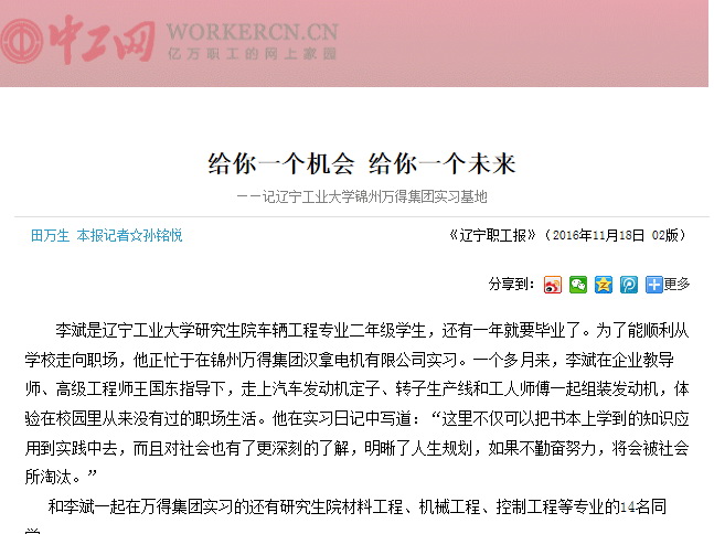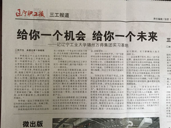 《遼寧職工報》是遼寧省總工會機關報,與《遼寧日報》同屬甲級A類報紙,全國發行。《錦州廣播電視報》由錦州廣播電視臺主辦,是具有國家統一刊號、遼西地區發行量最大、有效閱讀期最長的一張生活類報紙,發行覆蓋錦州全區。此次兩家報紙同時刊載的分別是由《遼寧職工報》記者孫銘悅采寫的《給你一個機會 給你一個未來》和集團《萬得資訊》編輯部采寫的長篇通訊《高校與企業牽手 拓寬大學生成才路》,“高校與企業聯合培養人才模式,著實為解決大學生實習難提供了一個可行性方案,同時也拓寬了大學生成才之路。目前,一項更加宏偉的計劃——‘遼寧省汽車工程實踐教育中心’正在萬得人的心中醞釀。屆時,除了汽車專業研究生,更多汽車專業的本科生也將會來到萬得集團實習,使人才培養更貼近市場需求。相信通過不斷努力,萬得集團大學生實習基地這塊人才培養試驗田,一定會結出更加豐碩成果,為民族汽車工業做出新的更大貢獻!”文章詳盡介紹了集團創辦教育實踐基地與遼寧工業大學聯合培養人才新模式。謳歌了萬得人勇于承擔社會責任的博大胸襟,展現了一個民營企業的時代風采。