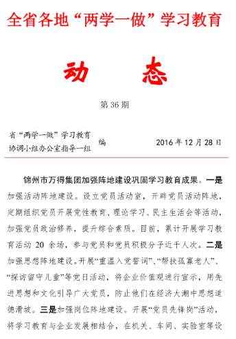 12月28日,由我集團黨群工作部報送的《錦州萬得集團加強陣地建設鞏固學習教育成果》信息,被省委組織部“兩學一做”學習教育協調小組辦公室選登在第36期市“兩學一做”學習教育簡報上。